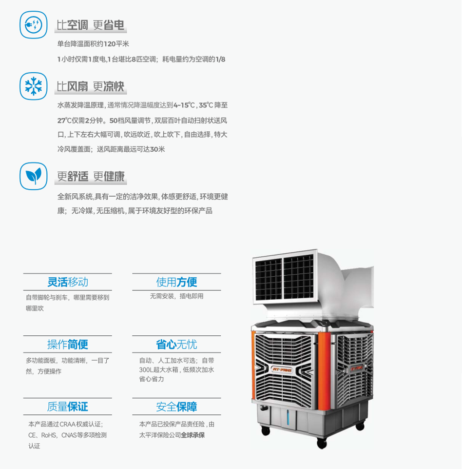 移動式環保空調,又稱移動式蒸發冷風機,是一種集降溫、換氣、防塵、除味于一身的蒸發式降溫換氣機組。移動式環保空調除了可以讓企業車間、公共場所、商業娛樂場合帶來新鮮空氣和降低溫度之外,還有一個重要特點----節能、環保!它是一款全新無壓縮機、無冷媒、無銅管的環保產品,主要部件核心-----蒸發式濕簾(多層波紋纖維疊合物)及1.1KW的主電機/是傳統中央空調耗電1/8,能為各行業更實在的省電。