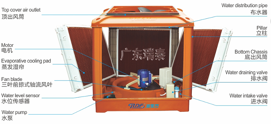 水冷空調(diào)的結(jié)構(gòu)包括:濕簾、風(fēng)葉、電機、水泵、水位傳感器、排水閥、進水閥等組件組成